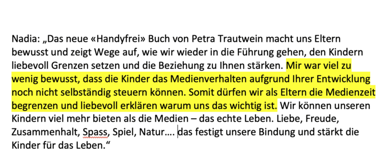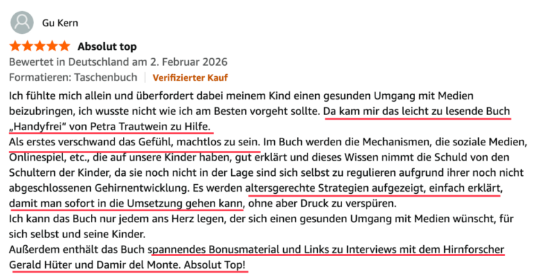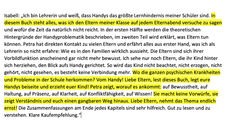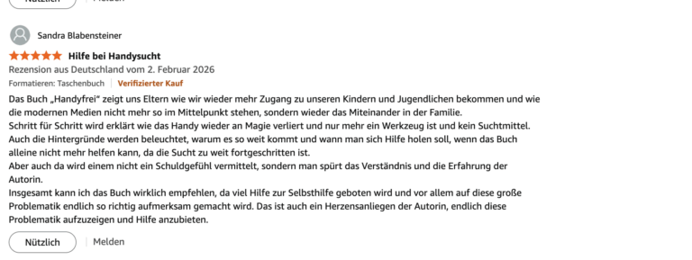 In ihrem brandneuen Buch „HANDYFREI“ zeigt sie Eltern, Erziehern, Lehrkräften und Menschen, die mit Kindern und Jugendlichen arbeiten, erprobte, bewährte und einfache Wege aus der Mediensucht.