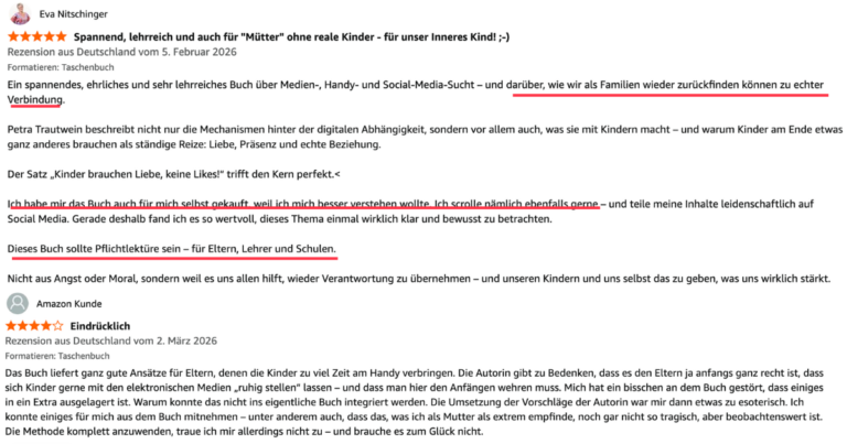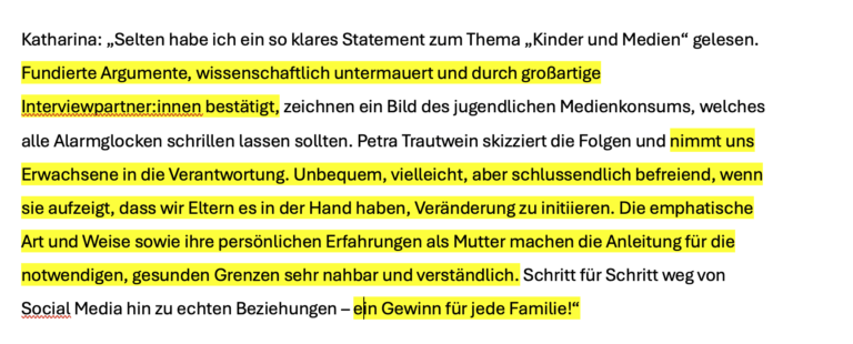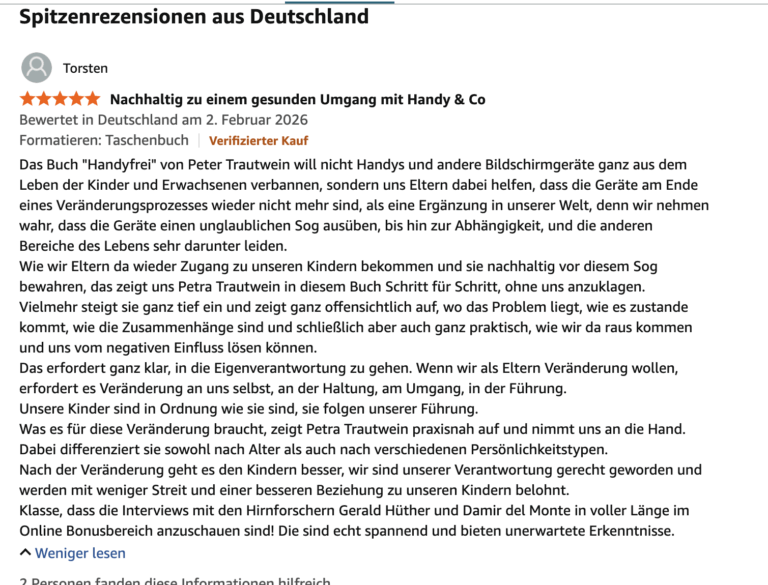 Petra Trautwein, erfahrene Coaching-Expertin und selbst Mutter, macht Schluss mit Ohnmacht und Selbstzweifeln. In diesem Buch nimmt sie Eltern an die Hand – ehrlich und lösungsorientiert. Gemeinsam mit führenden Experten wie Gerald Hüther und Damir del Monte zeigt sie, wie wir dem digitalen Sog begegnen können: mit Klarheit, Mut und echter Verbindung.