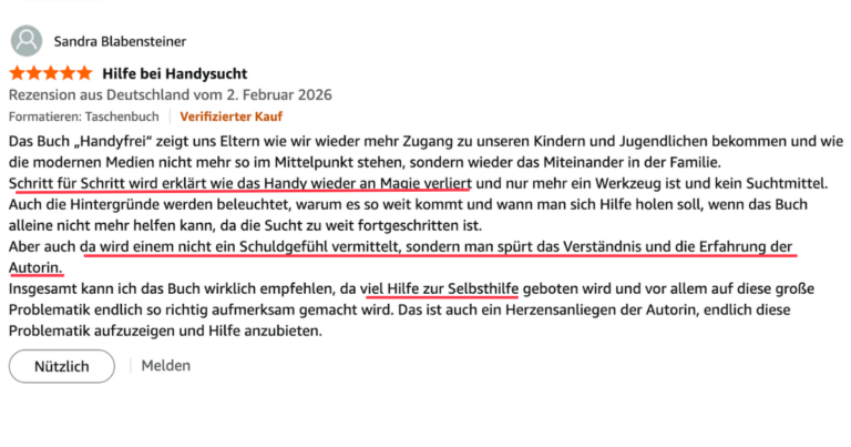 Das Buch „HANDYFREI“ stattet dich mit einem klaren, alltagsnahen und leicht umsetzbaren Schritt-für-Schritt Fahrplan aus.